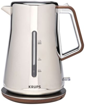Outfit your kitchen with the beauty of chrome in this sleek Krups Silver Art collection. Attractive water kettle lets you serve right from the carafe.2qt. capacity1500 watts of power quickly brings water to a boil Automaticopening lid for easy filling Dualsided water level indicator is convenient for righthanded or lefthanded users Cordless 360degree rotating base for easy serving Automatic and manual shutoff Illuminated on/off switch Removable washable limescale filter prevents particles in beverages and scale buildup Stainless steel and chrome with woodlook accents ... Read more